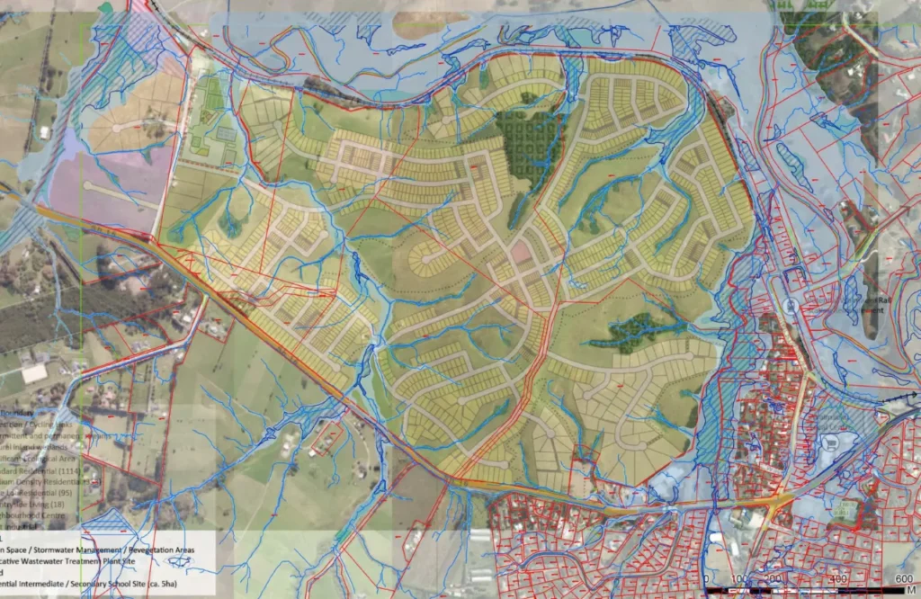 The development will turn 196 hectares of farmland into something like 80% impermeable surface, all that rain that would have soaked into the ground will now flow to the river.